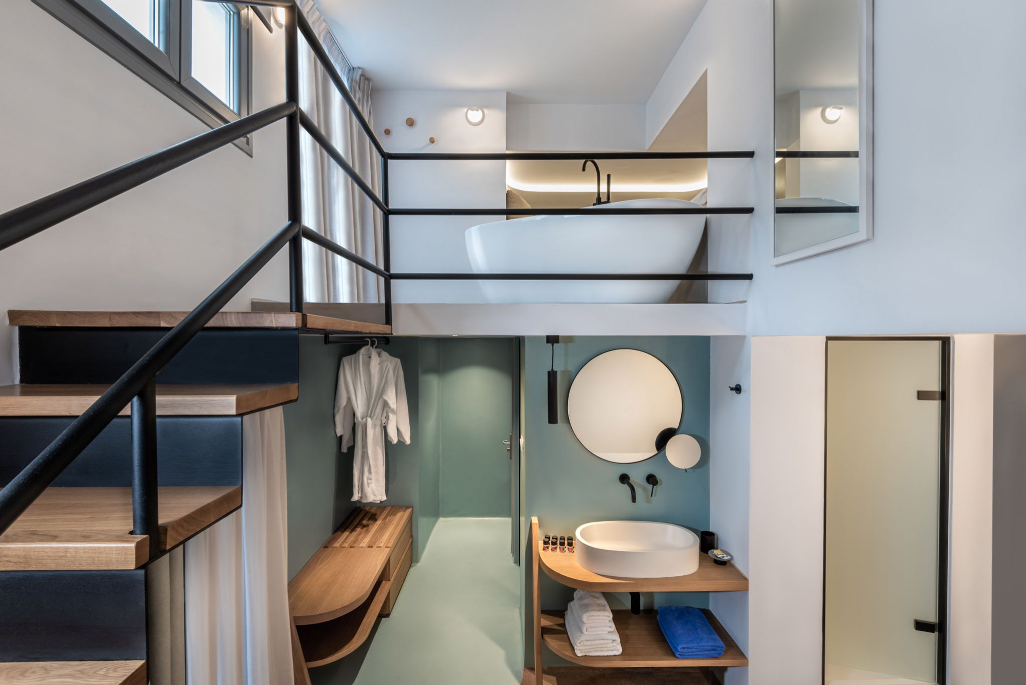 There is an upper sitting area with a built sofa where you can lie back and relax. The bathroom is equipped with a hydromassage shower jet that will surely have a de-stressing effect on you.